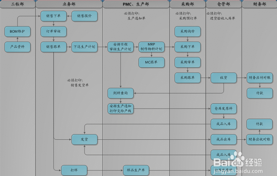 1、销售订单:销售部门接客户采购计划,根据客户要求,查看是否有库存,有——即给客户发货;无——即下生产任务给生产部门,要求安排生产;机器生产完工后,即可给客户发货。