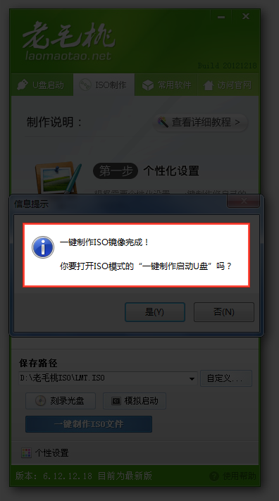 ISO模式2.2:点击“一键制作ISO文件”按钮后程序会在“D:\老毛桃ISO\”文件夹下创建LMT.ISO镜像。