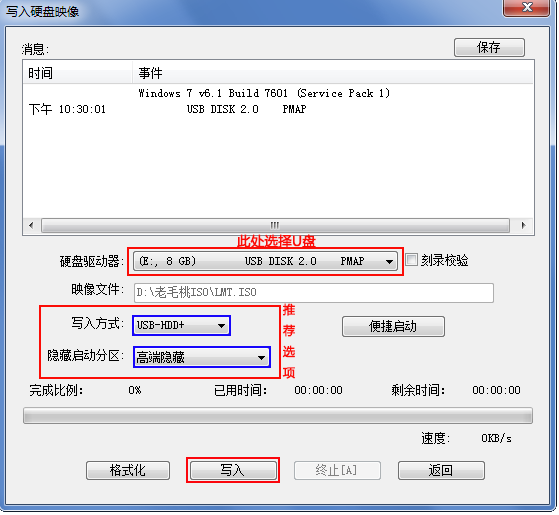 ISO模式2.3:打开ISO模式的一键制作启动U盘,点击ISO模式里的按钮,按照图中推荐选项进行选择,最后点击写入按钮等待写入完成。