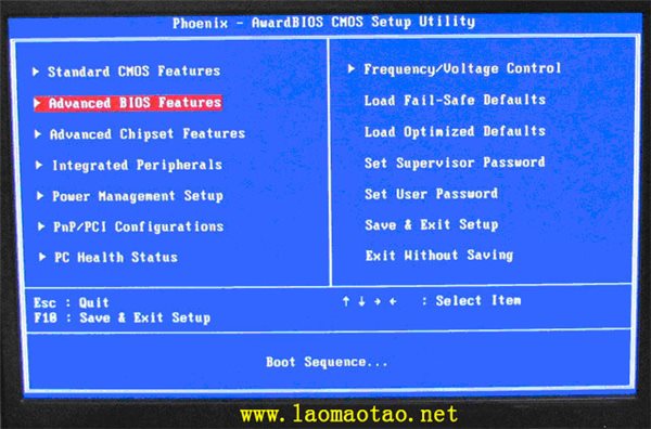 在计算机启动的第一画面上按"DEL"键进入BIOS(可能有的主机不是DEL有的是F2或F1.请按界面提示进入),选择Advanced BIOS FEATURES ,将Boot Sequence(启动顺序),设定为USB-HDD模式,第一,设定的方法是在该项上按PageUP或PageDown键来转换选项。设定好后按ESC一下,退回BIOS主界面,选择Save and Exit(保存并退出BIOS设置,直接按F10也可以,但不是所有的BIOS都支持)回车确认退出BIOS设置。