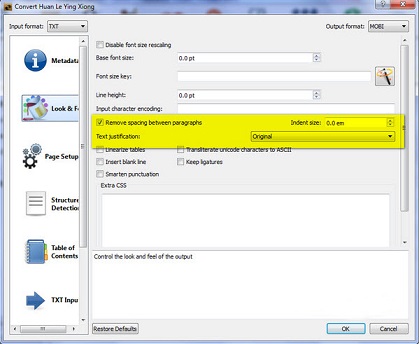 16.如果不选中这个选项,原有的段间空行会被保留,且首行缩进通过indent size来控制,这是单位是em,不大好刚刚好控制在两个汉字的标准(因为kindle当中的字体是可以放大缩小的),所以我们通过排版,在每行首行前加入两个全角空格来保证首行缩进。