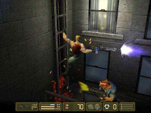 到第二个场景后,跳上平台,爬上铁塔,两级跳跳到屋顶,得到double damage,下来跳到前面的楼上,这里小心,有飞行机械(激光攻击,还会特么的会自爆!还好智商偏低,带着他跑)继续往前走,干掉三猪头,跳上正在吹风的吹风机,捡到50发子弹,跳到前面的楼上。顺梯子下去,有几个猪头,走到门旁会提示门是锁着的。爬上梯子跳到左边的类似空调的箱子上,往左走,不用我说了,大脚踢开破墙,找到secret place 4,和第六个nuke,返回门前,往右走,跳到正在工作的吹风机上,捡到第七个nuke,落到最高层的铁架上,干掉猪头,往右跳,捡到shotgun,然后见看到,人质和开关,解救“美女”,得到20生命,打开开关,刚才锁着的门打开了。跳下来,看到黄色的电子门,现在没有钥匙,干掉几个猪头后,往左走,在下层,打爆铁桶,解决一个猪头后,找到secret place 5,和第八个nuke,然后利用吹风机回到左边,进门。