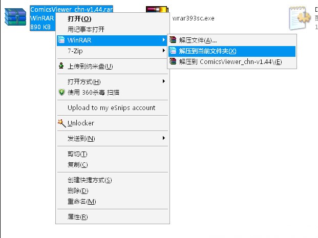 1.首先,把你下载下来的压缩包 ComicsViewer_chn-v1.44.rar 放到你想放软件的地方,然后 右键 -> WinRAR —> 解压到当前文件夹如图: