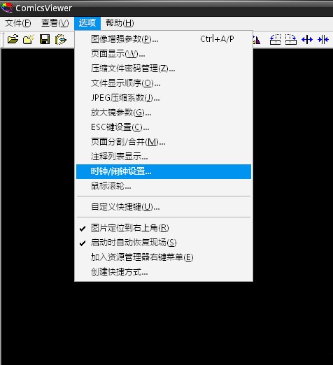 拥有可设置的时钟、闹钟,防止因为看漫画看得太投入而废寝忘食。不过时钟只有在Windows 2000/XP/2003下才能显示,不能在Windows 95/98/me/NT下显示。闹钟精度约为正负10秒。时钟大小、透明度可以通过选项进行调节。如果您对ComicsViewer的时钟比较满意,希望在不启动ComicsViewer的情况下也能看见它,您可以到我的网站下载NoteIcon软件,ComicsViewer的时钟是从它那里COPY过来的,不过它的窗口缩到最小后时钟还能显示。