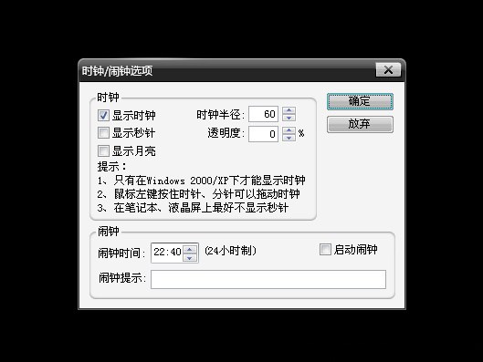 时钟的秒针每秒重画一次,在笔记本、液晶屏上,频繁的重画理论上说会对液晶屏的寿命造成影响,因此建议关闭秒针显示。另外为了减轻定时器对CPU时间的消耗,将闹钟精度定为正负10秒,听起来似乎不是很准,不过应该够用了。
