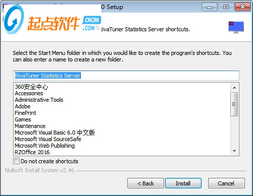 6、选择软件菜单文件夹,默认文件夹“RivaTuner Statistics Server”,点击Install;
