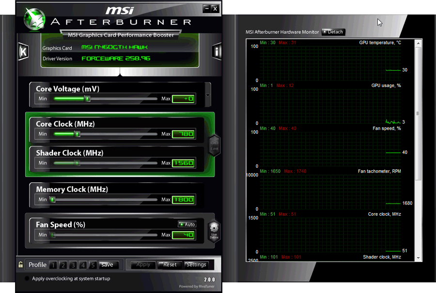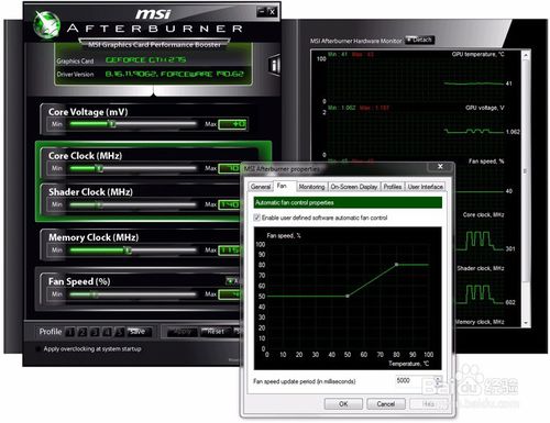 探索超越显示卡的极限范围听起来很危险,其实操作起来比想像中容易许多,MSI Afterburner操频工具容易使用的介面,让消费者能够简易、精确的设定显示卡各项参数。当使用者想要提高GPU时脉和电压时又怕高温会伤害硬件设备,只要透过Afterburner设定风扇转速就能轻易在效能表现与温度中取得最佳平衡。