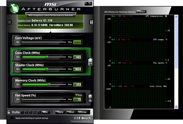 MSI AfterBurner可支持Windows XP/Vista/7 32/64bit操作系统,支持GeForce及Radeon显卡使用。