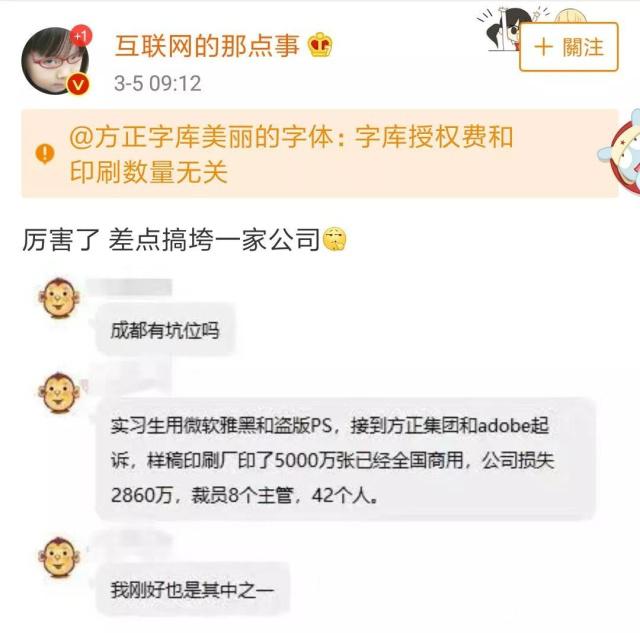 3月5日9点多,微博大V“互联网的那点事”发布了一张截图,称有位实习生使用了“微软雅黑”和盗版PS,接到方正集团和Adobe起诉,公司损失2860万,多人被裁员。