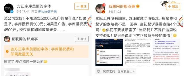 事情迅速传播,不少人在评论区现身说法表示自己也曾经踩过坑。至当天下午五点多,方正官方微博“方正字库美丽的字体”转发并回应称,授权费和印刷数量无关,疑似辟谣。但随后“互联网的那点事”表示方正故意混淆概念,授权费和起诉的索赔费不一样。双方battle的观点都得到了不少网友的支持。