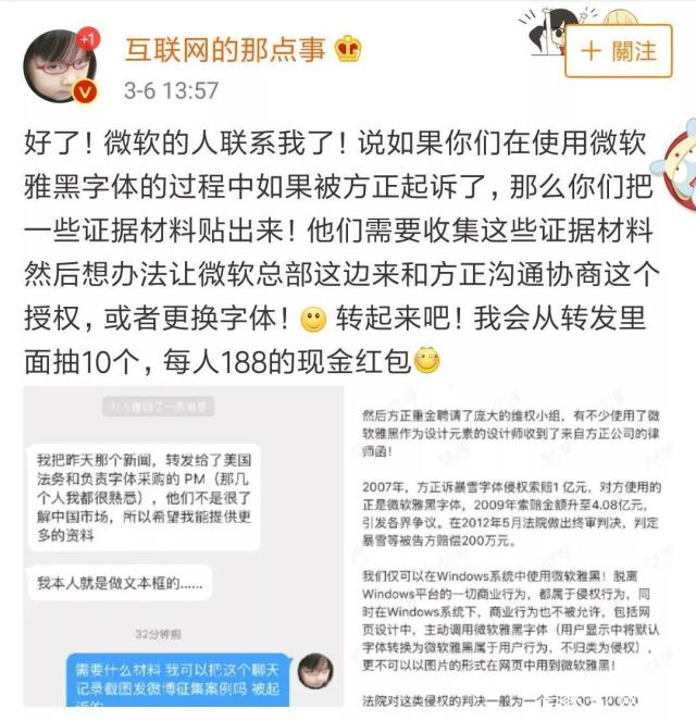 截至目前,“互联网的那点事”再发微博表示微软的人已经联系他,他们会想办法让微软和方正协商授权或者更换字体。