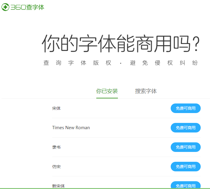 360 官方推出了查字体版权工具—— 360 查字体,帮助用户检测电脑上安装的字体是否免费或是“商用需授权”的。【软件功能】