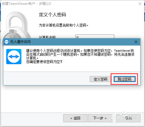 如果不设置密码,会跳出一个提示,告知密码为空将由TeamViewer 13自动生成分配一个随机密码。在使用该软件进行远程时需要记住此密码。这里直接点击“跳过密码”