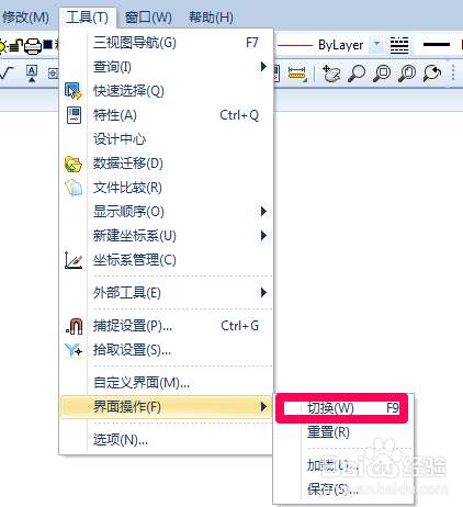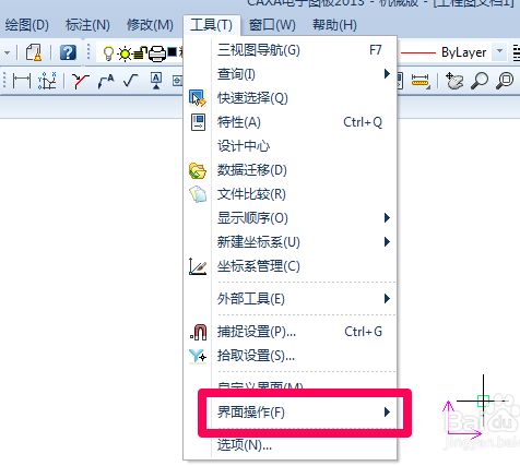在下拉的菜单中找到【界面操作】,把鼠标光标放到该选项上。