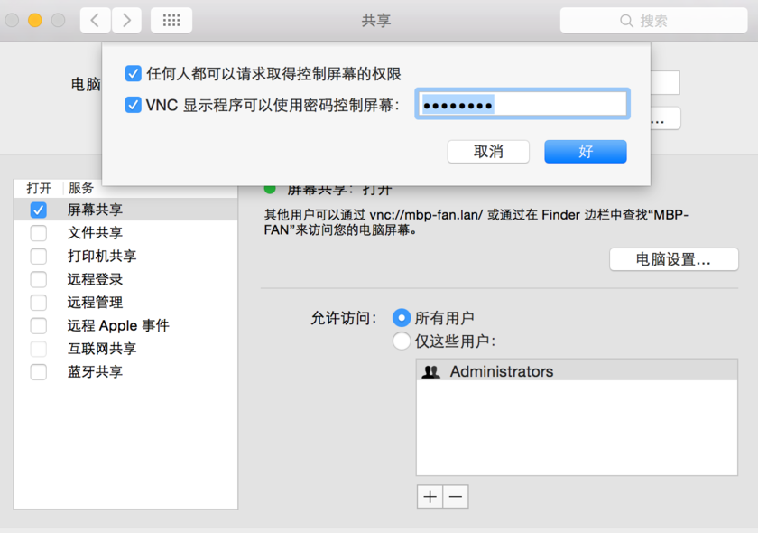 Mac系统偏好设置-共享-打开屏幕共享,并设置VNC控制屏幕密码。