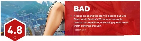 《海贼王:世界探索者(One Piece: World Seeker)》是万代南梦宫即将发行的开放世界动作冒险新作,将带领玩家扮演路飞前往熟悉的海贼漫画世界。今日IGN公布了对它的评测,只给出了4.8分,认为它虽然看着不错、剧情也可以,但其长达20小时的单调重复的战斗、以及误导人的任务让人无法忍受。
