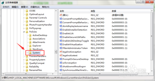 3.找到路径:HKEY_LOCAL_MACHINE\SOFTWARE\Microsoft\Windows\CurrentVersion\Policies\System