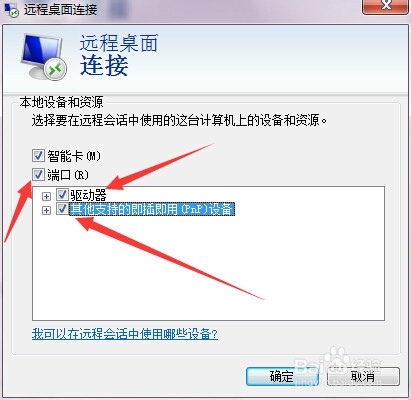 4.钩选端口,钩选驱动器,这样本地硬盘就可以在远程桌面里面访问,钩选其它支持的即插即用设备,这样U盘也可以用了.