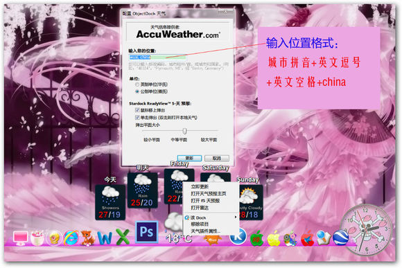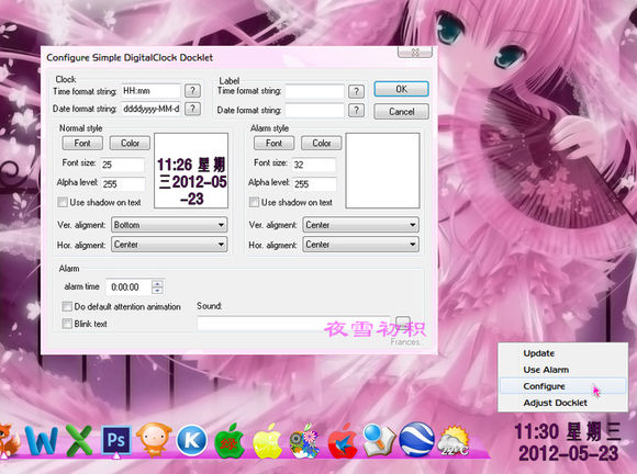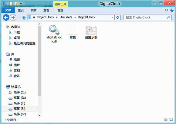 背景图片可以选取任意自己喜欢的图片,如果需要达到下图所示的效果,可以选取*:\ObjectDock\Docklets\DigitalClock文件夹内的透明背景图片,然后编辑设置适合自己的该Dock的位置和大小。