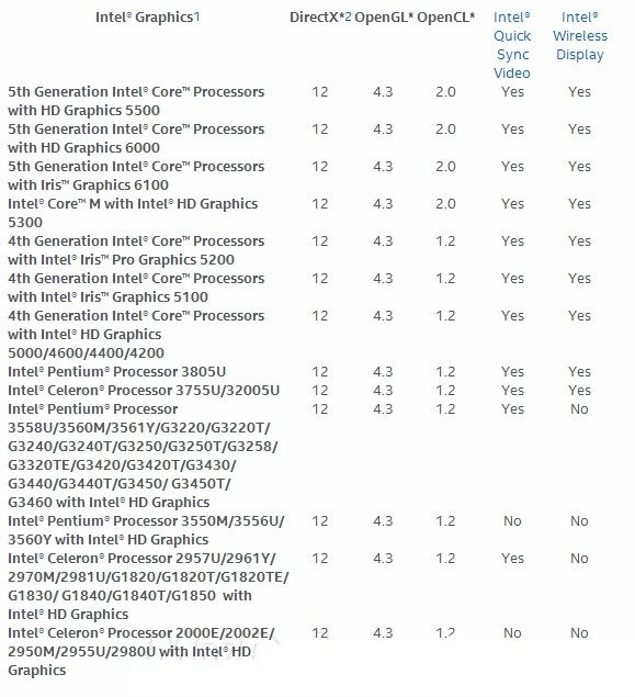 Intel核心显卡支持DX12一览:
