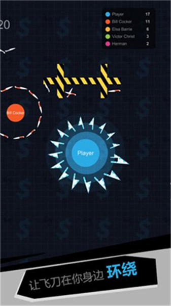 一款创新玩法的.io类游戏,通过对一大堆飞刀的熟练操控来进行混战,独创的龟缩防御机制(俗称王八状态)让你能轻松秀死对手。数十种成就和飞刀皮肤看你能打出多少种。从双杀到七杀,刀剑两开花!
