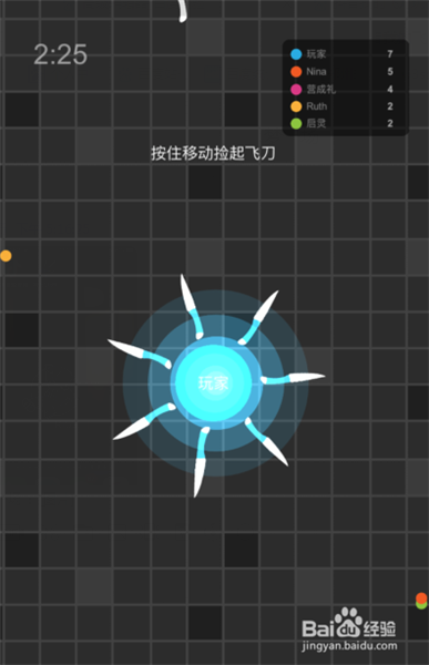 1、在游戏界面,常按就能进入到游戏里边,进入后第一件就是收集飞刀,飞刀数量毕竟有限,被别人先抢到你就注定会失败,所以进入后第一时间先抢飞刀,足够壮大后再去想吞并别的玩家。