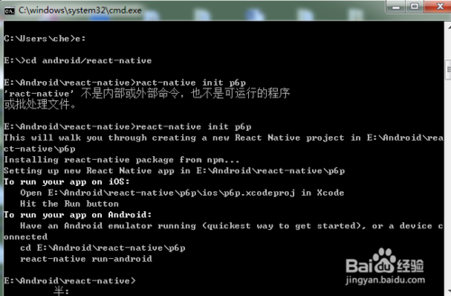 cd选择你想要存放项目的目录下,执行:react-native init cheProject(项目名称),回车。这个过程比较慢,至少10分钟以上。当出现以下画面,恭喜您。