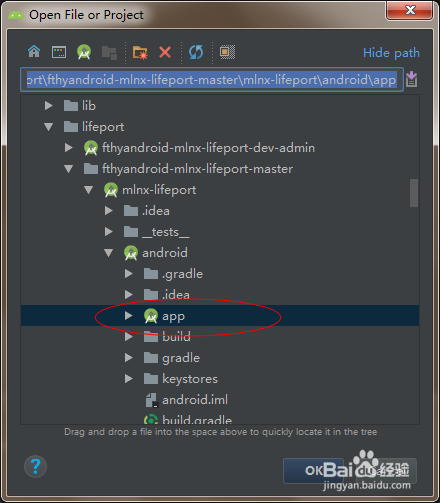 需要特别注意的是这一步,犯了几次错,一定要选择这个Android项目下的app,用这个作为根目录