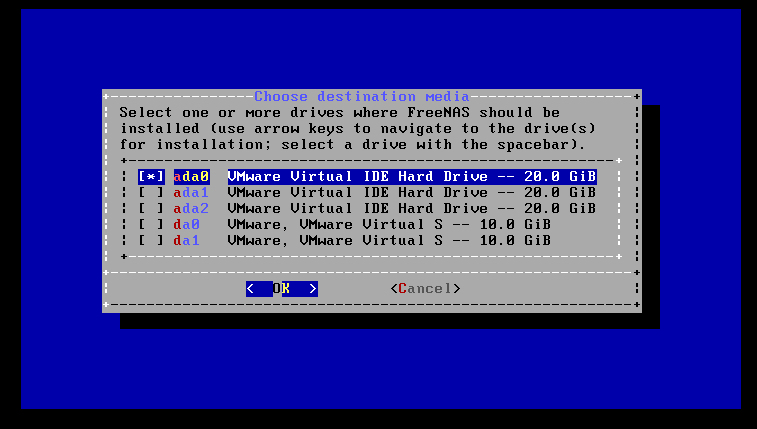 其中freenas将会安装到一块20G的硬盘中,freenas系统将会占用一整块盘,这里多加了好几块硬盘不一定都用上,但是尽可能模拟真实环境吧。