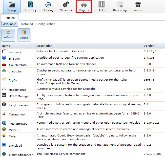 通常,安装在FreeNAS中的插件都有独立的WebGUI管理界面,在左侧的系统菜单中展开“Plugins”插件,这里也会列出所有已安装的插件,重点在于,双击这里列出的插件,会弹出插件的属性窗口,可以对插件的各项功能进行设置。