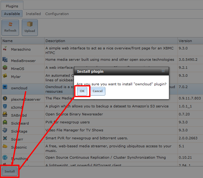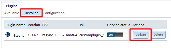 点击“Update”更新按钮后,系统会弹出安装提示,是否更新XX插件,点击“OK”确定,系统会自动从FreeNAS官方插件服务器中下载该插件最新版本的安装包,并自动执行安装。