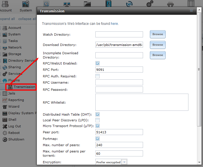 如下图所示,点击系统菜单中的“Transmission”插件,会弹出该插件的设置窗口,在窗口中的第一行“Transmission’s Web Interface can be found here”插件的WebGUI界面点此打开,点击“here”文字,就会在浏览器新选项卡中打开插件的使用界面。