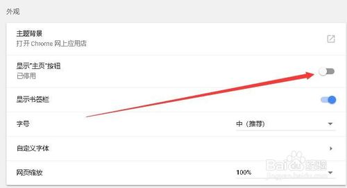 3、这时就会打开chrome浏览器的设置页面,找到“显示主页按钮”设置项,把其后面的开关设置为打开。
