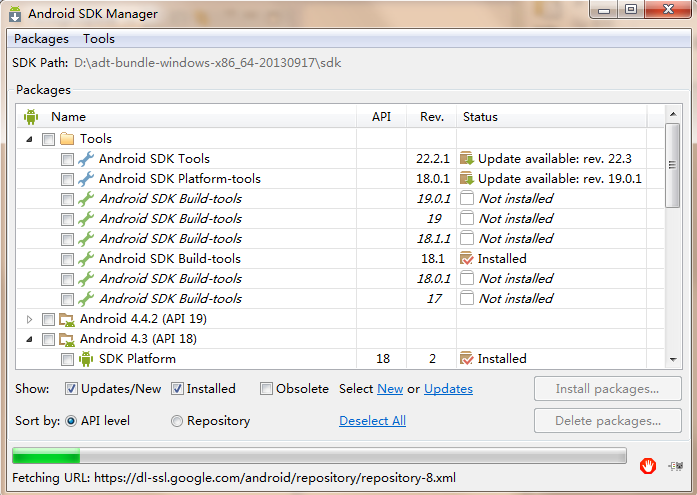 其次,将下载好的adt和ndk解压在指定目录就行,运行adt里面的sdk目录下的eclipse,在菜单栏中点击windows,点击AndroidSDKManager在线更新sdk,有更新的话尽量全选,这个更新的过程会话费较多的时间,没办法,那就等吧!直至sdk更新完成(后面的在xcode下配置环境同样需要经过这一步)