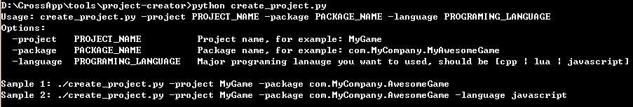 创建工程使用的就是这个.py文件,打开dos,通过cd命令,将当前目录定位到CrossApp\tools\project-creator,运行pythoncreate_project.py就可以看见新建工程的示例说明,这里我们新建一个名为MyFirstApp的工程