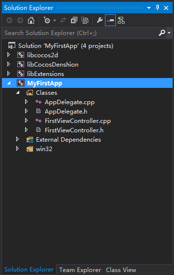 双击运行MyFirstApp.sln,进入vs工程界面,vs界面右面的解决方案资源管理器就是我们新建的工程的代码结构,展开MyFirstApp下的Classes目录,可以看见工程已经默认为我们创建好了两个类,其中AppDelegate就是我们工程的入口类,我们只需要在Classes下面添加代码就可以开始编写我们自己的App了。