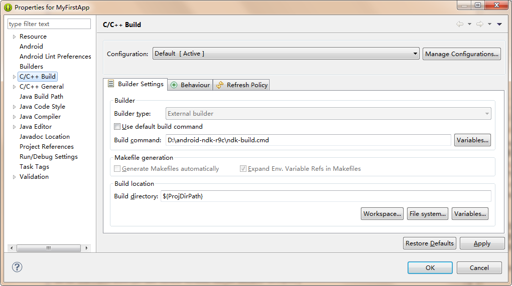 然后需要为工程配置ndk编译环境,在菜单栏选择Project,点击properties,在打开面板中点击C/C++Build,在Buildcommand一项中,把默认的command替换为自己nkd目录下的nkd-build.cmd,例如:D:\android-ndk-r9c\ndk-build.cmd。