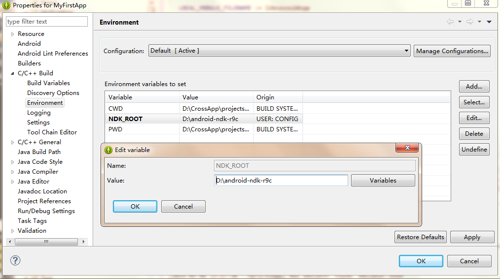 至此windows开发环境搭建完成。对于第一种,打开build_native.sh文件找到#paths这行,在下面添加NDK_ROOT=”D:/android-ndk-r9c”这句话就可以了。如果是第二种添加方式,在properties页面展开C/C++Build,在Environment新建一个名为NDK_ROOT的变量,值为NDK的解压目录。