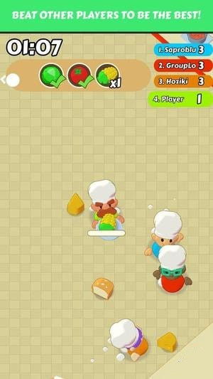 玩家需要控制厨师在大地图上寻找食材,进行简单的加工,并完成订单要求。与传统的IO玩法不一样,更重视在完成过程中的竞争。玩家不用担心自己辛辛苦苦的成果被完全夺取,只要专心完成自己的厨房任务,并阻止其他玩家完成即可。