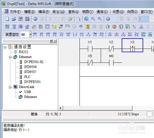 4、编写完一个简单的程序后,依次点击菜单栏中的“编译--梯形图=>指令”,软件就会自动编译程序,并在没有错误编译成功的情况下,在主窗口的最下方给出提示。同样如果程序有错误,软件也会提示编译失败,并给出错误大的位置。如下图所示: