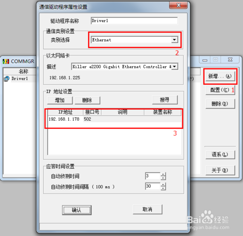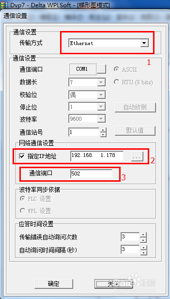 1)打开编程软件WPLSoft,在菜单栏中选择“设置”里的“通讯设置”,选择以太网,并输入BCNet-DVP的IP和端口号;
