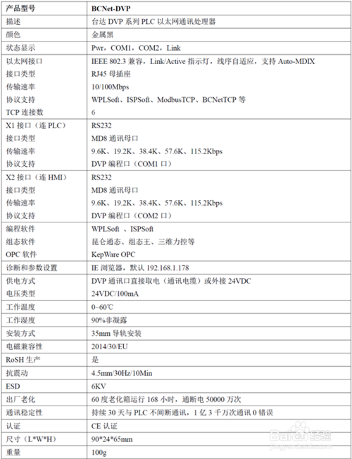 1、安装在35mm的导轨上,COM1口直接连接至DVP的MD8编程通讯圆口,并扩展一个COM2口用于触摸屏通讯。BCNet-DVP可直接从PLC编程通讯口获取电源,也可外接24VDC电源。