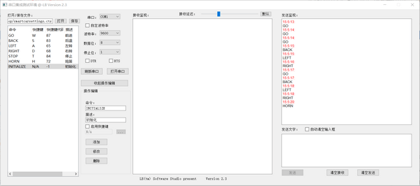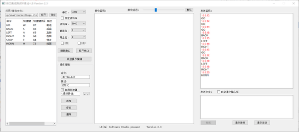 特色在可以保存串口发送命令以及可以使用快捷键发送命令,这个小东西可以很方便的输入保存好的命令,特别是遇到一些固定格式或者带有前缀后缀的串口数据发送。不想每次重新打就保存起来下次打开用,非常方便,还有就是可以拿来玩串口遥控的东西。比如遥控车,自制四旋翼之类的;【使用方法】