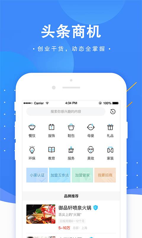 小渠商机app是一款给创业者提供合作机会的软件,小渠商机这款软件每天都会有许多的加盟商信息发布,用户可以在这款软件上寻找意向合作伙伴与之合作,共同发展。并且本款软件每天都会更新商业资讯,用户可以在这款软件上获取到最新商业信息,帮助用户了解商业经济现状。