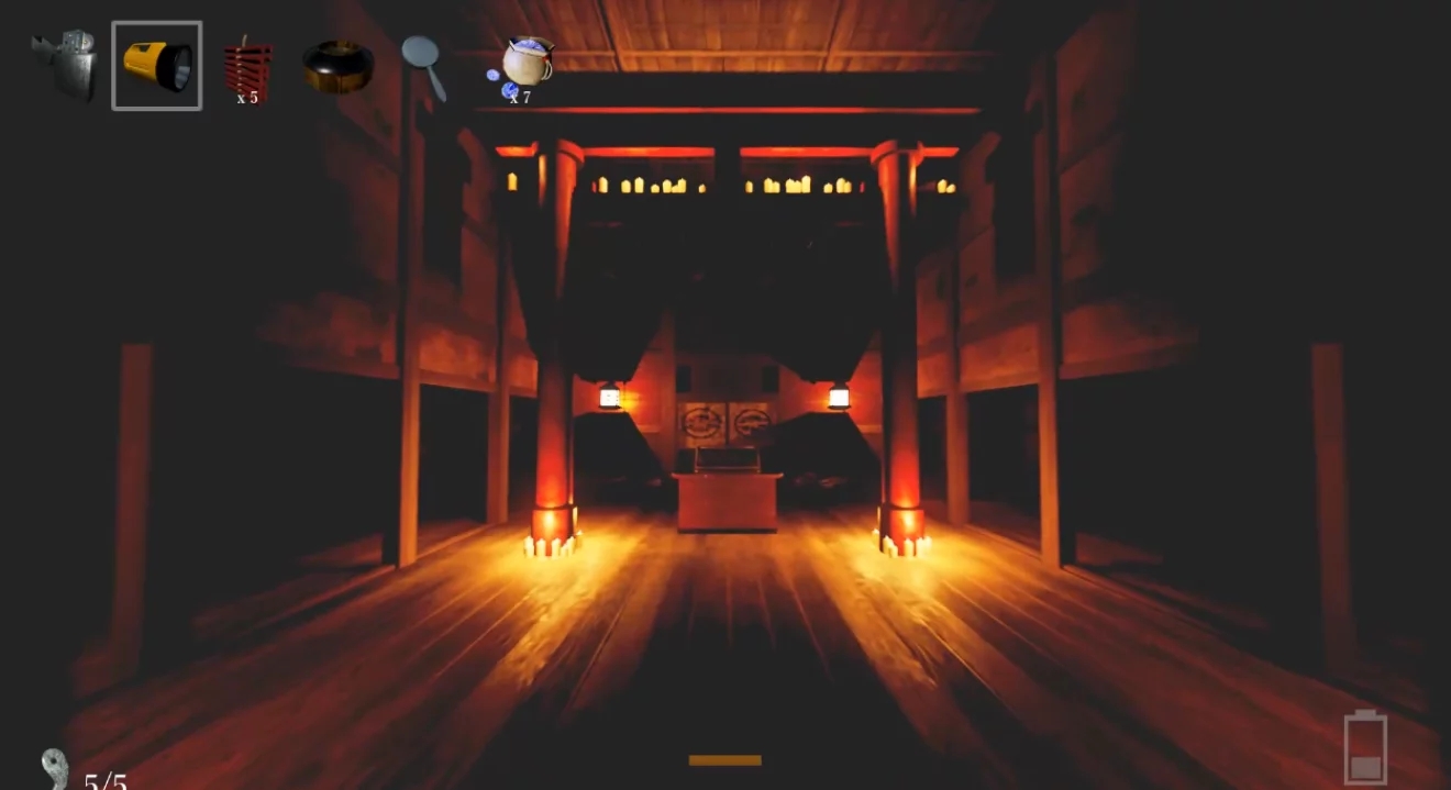 手电筒:本山大叔当年家里唯一的家用电器。和打火机同为照明工具,不同于打火机的是,电筒的光亮亮度高,可以照到前方很远的方向,但是无法照亮周围附近的死角,而且比起打火机来,其发出的光亮更容易被鬼影注意到。有电量限制,电量降低到一定程度时亮度和照明距离均会大幅度下降,但再次找到电筒时电量就会补满,所以大可不必过于节约电量而舍不得用。