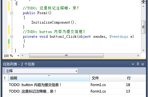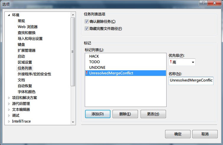 的,估计是少数吧。如果你喜欢用“任务列表”记录一些要做的事情,这个小功能最适合你了。你可以再VS 2010的菜单上找到任务列表窗,点击“菜单->视图->任务列表”,你也可以点击快捷键“Ctrl+W,T”。VS还提供了,HACK,UNTODU,UnresolvedMergeConflict标记注释,你可以在“工具->选项->环境->任务列表”找到并且编辑/添加/删除标记注释。下面是图示: