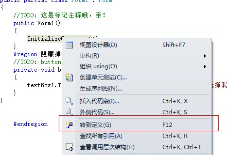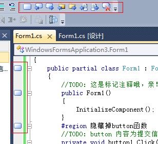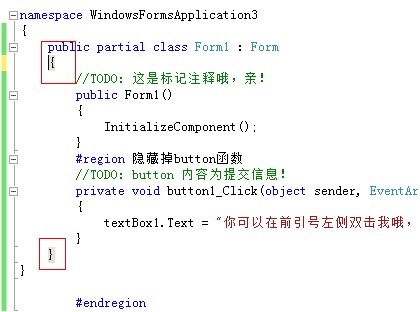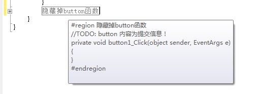 当代码越来越多的时候,你会期望可以隐藏一些代码,而#region 和#endregion 就是这样的功能。你可以在任何位置隐藏任何代码。即使是隐藏的内容不属于同一个函数。你可以点击#region旁边的+/-,展开/隐藏代码。在隐藏的时 候,当你的光标放放置在备注上面的时候,VS会显示出隐藏的代码内容。