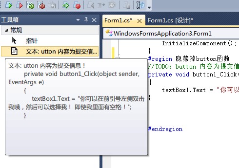 你可以选中你的代码,然后拖入工具箱的空白处,你的代码就保存到工具箱了。就像你将控件拖 入代码页面一样,也可以将代码拖入工具箱中。以后你就可以像使用控件一样使用重用的代码。这是非常方便的。而且工具箱的内容不会因为你关闭VS而消失,在 你下次打开VS的时候工具箱同样保存了你的代码。如果你需要查看工具箱保存的代码而又不想拖到代码页面中,你只需要将光标停留在工具箱的代码图标上面。如 图所示: