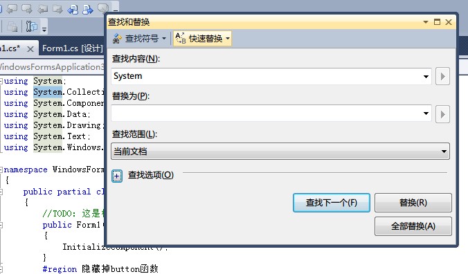 当你想查找/替换掉某个字符串的时候,你可以按快捷键“Ctrl+F”或者“Ctrl+H”,进行这一操作。另外VS支持正则表达式和通配符。