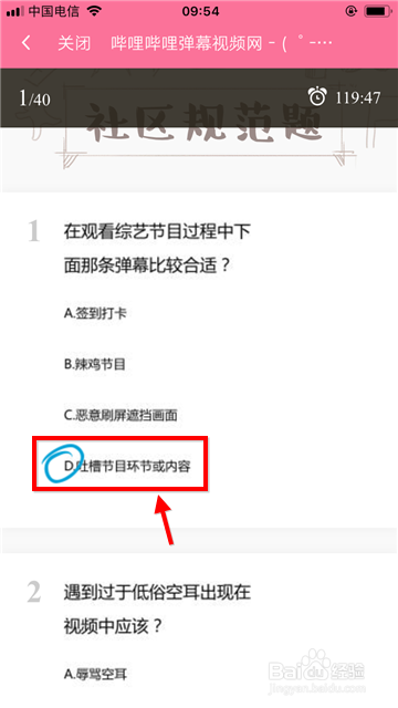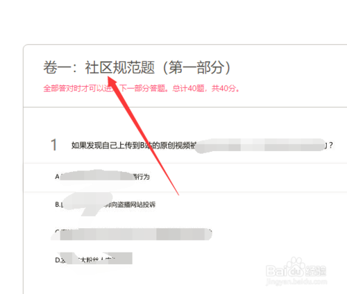 b站对社区规范题第一部分是强制要求全对的,如果有做错部分就进不了下一步,错题前的选项也会变成红色,全部修改后才能进入下一环节。